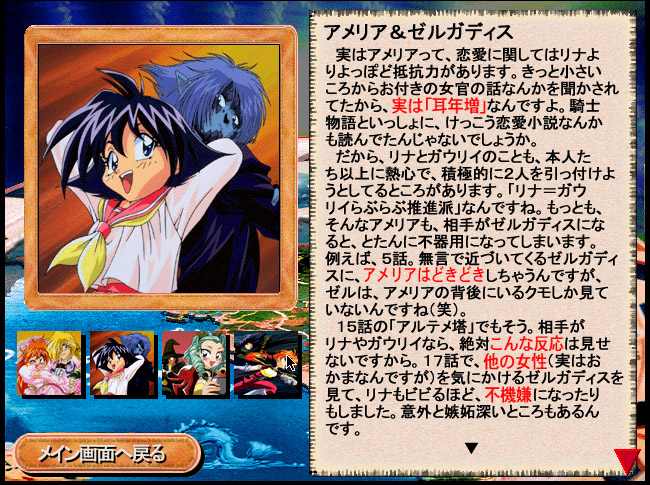 昔のMacを起動させて、久々にみてみました。 らぶらぶVカップリングのゼルアメの記事にニヤニヤ。 でも、そうなんですよねー。 アメ→ゼルは憧れだか恋愛だか謎にしてもあるとは思うが。 ゼル→アメがね…。 うん。NEXTであんだけ庇ったりさ、してたからなんか芽生えててもいいと思います。 りたーんずのデスクトップアクセサリーの、ゼルの岩風呂のスクリーンセイバー。 ゼルが同行メンバーに付いて愚痴るのですが、アメリガ無くて嬉しいような悲しいような…。 彼女の事どう思ってるのさ!! 最後のオチで、どしふんに吹き出しました。 しかも六尺とは…。 この、デジタルコレクションシリーズ。 古いパソじゃないと起動できないのが痛いです…。 これがあるから、スレイヤーズはムック本が出なかったのかなぁと。 確かに凄い情報量ですけどね。 レボエボはコミカライズしか出てないので、 シリーズまるっと網羅したムック本を出して欲しいですね! PR |